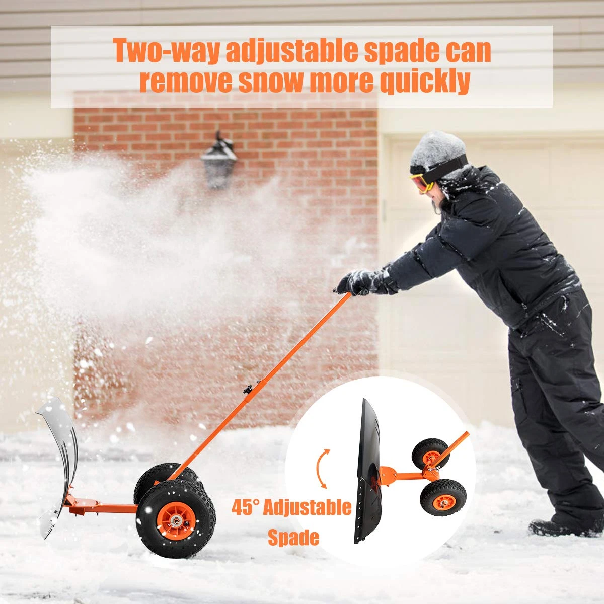 The snow pusher could decrease backache and pain by traditional snow removal as you want to simply pushing forward. Featuring with durable metal structure and excellent workmanship, the snow pusher can clear snow piles quickly with its giant plate. Adjustable push rod permits you to push snow at different positions and angles, making it suitable for all members of the family as well. Soft pads on the maintain reinforce your snow removal experience and help you focus on work. Two large wheels help you keep an eye on the push rod better and reinforce stability.