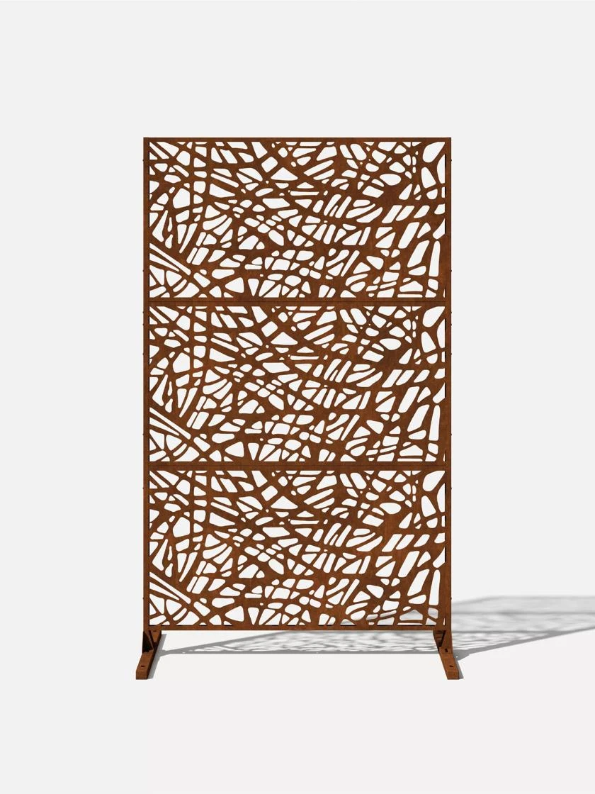 Privacy has never looked so good! Transform your backyard or deck with an outdoor three-panel privacy screen set. These screens are modern, yet versatile. Use a set to hide an unsightly view, to block unwanted direct sunlight, create privacy or to frame an outdoor room. Made from 1-1/2 mm laser cut steel designed to resist corrosion through all seasons.